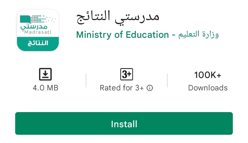 ثم البحث عن "نتائج مدرستي" ، حيث توفر الوزارة نسخة لهواتف iPhone وأخرى للأندرويد ثم قم بتنزيل تطبيق مدرستي ، ويمكن الحصول على النتائج بالضغط على "تثبيت". يمكن الحصول على رابط تحميل البرنامج حسب نظام التشغيل من خلال ما يلي: